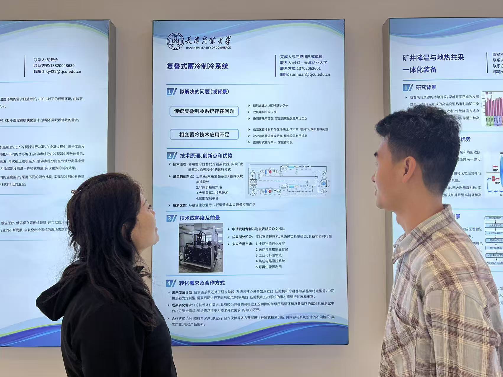 在路演专区的技术路演板块,共有来自17所高校、研究院所的50个项目以“海报+实物”的形式展出,其中我校刘斌教授的“多物理场耦合保鲜舱”、胡开永副教授的“基于物理模型和大数据的制冷系统设计软件”、赵松松副教授的“基于平行板电容器原理的智能除霜控制研究”等12个项目入选。在此基础上,从50个项目中进一步遴选出20个项目在路演专区面向企业组织宣讲会,孙欢教授级高级工程师的“复叠式蓄冷制冷系统”、代宝民教授的“小型制冷装置部件及系统仿真软件开发”2个项目成功入围宣讲会。我校参展的科技成果,集中在工业及商用制冷及相关部件,压缩机、换热器、阀件与其他辅助部件,空气处理、控制设备与系统,应对气候变化及其他产品技术4个方向。