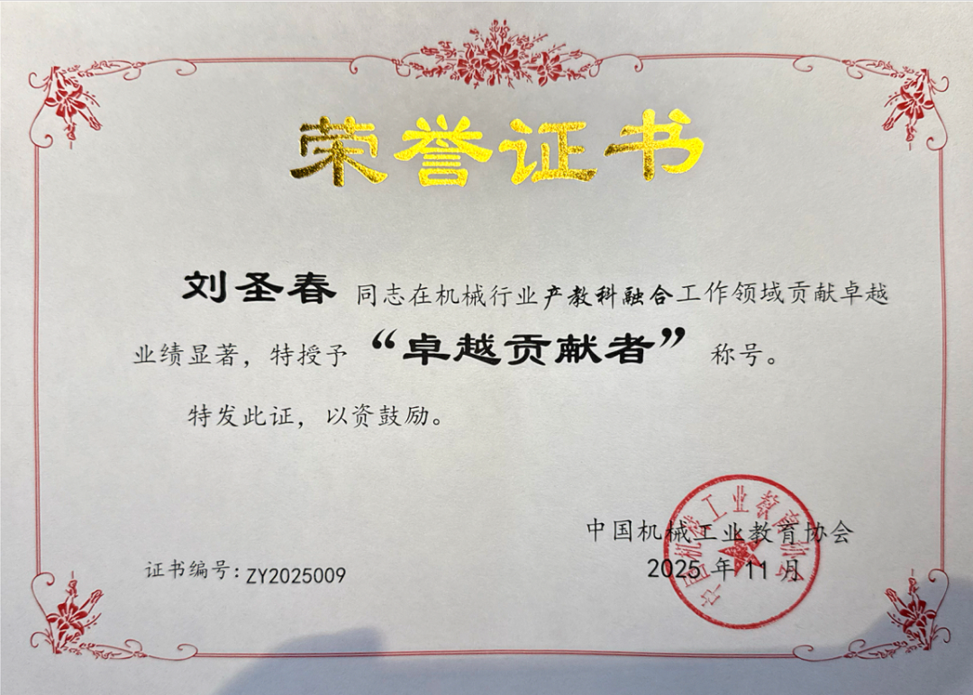 近日,在中国机械工业教育协会组织的“机械工业教育产教科融合卓越贡献者资质评价”工作中,机械工程学院院长刘圣春教授凭借在机械行业产教科融合领域的卓越业绩与突出贡献,成功获评“卓越贡献者”称号。