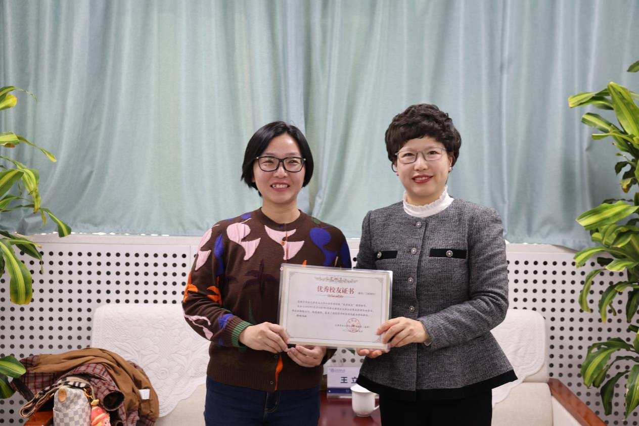 王立云代表学校对吴弦返校表示热烈欢迎,充分肯定了校友在传媒行业深耕多年取得的成绩,对她支持母校发展和学院建设的实际举措表示衷心感谢。会上,王立云为吴弦颁发“优秀校友”证书,并赠送在学资料纪念卡。